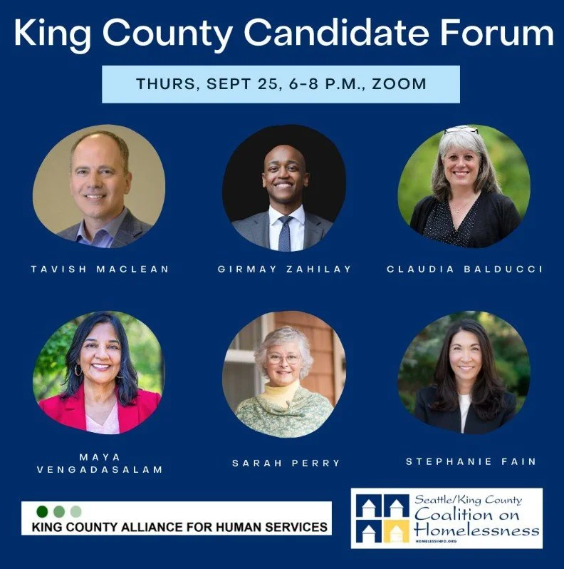 Seattle-King County Coalition on Homelessness and the King County Alliance for Human Services will host a virtual King County candidate forum, with a focus on human services for County Executive and Eastside County Council candidates. Learn more and register