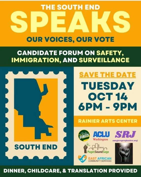 Candidates for Seattle Mayor, City Council, and City Attorney will take questions at this forum centered on some of our community's most critical concerns. Free dinner, childcare, and interpretation included. Hosted by Whose Streets? Our Streets!, ACLU of Washington, The Black Rose Collective, East African Community Services, Puget Sound Sage, Rainier Ave Committee, and Surge Reproductive Justice. RSVP here
