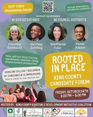 Join the King County Equitable Development Initiative Coalition to talk with King County Council candidates about displacement, equitable development and rooting communities in place. Coalition members are Eastside For All, Friends of Little Saigon, Multicultural Community Coalition, Na’ah Illahee Fund, Puget Sound Sage, and White Center Community Development Association.